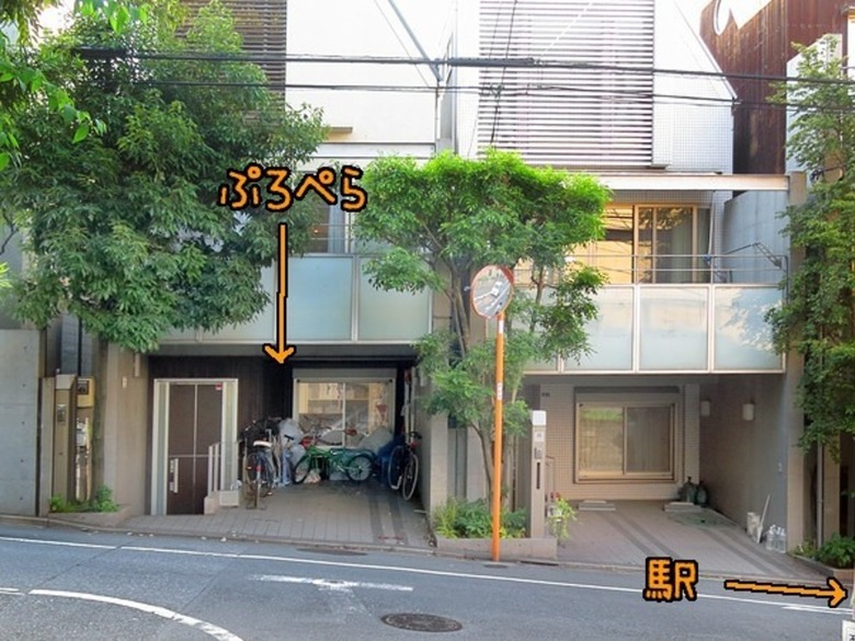 ↑道の向かい側正面から見たところ。向かって右が歩いてきた方向。同じ建物が2軒並んだ奥がぷろぺらです。ようこそ!