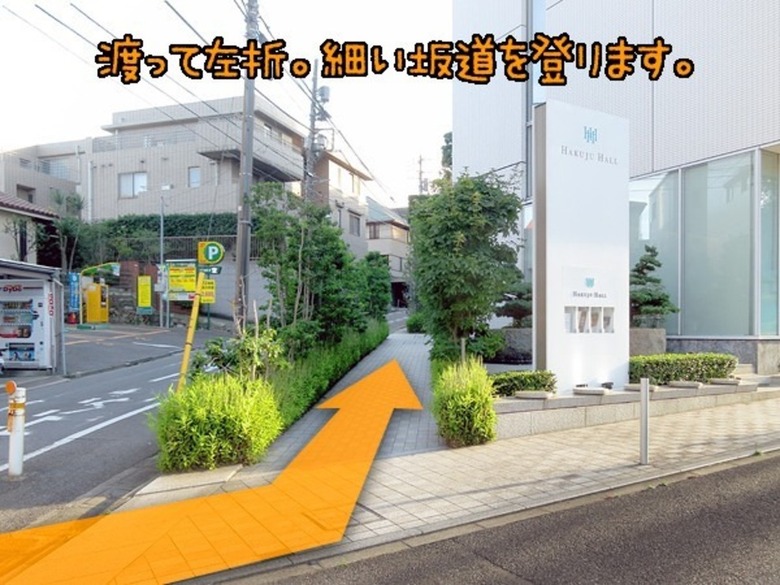 ↑こういう感じで左折。角に「Hakuju Hall」があります。その手前を左へ。