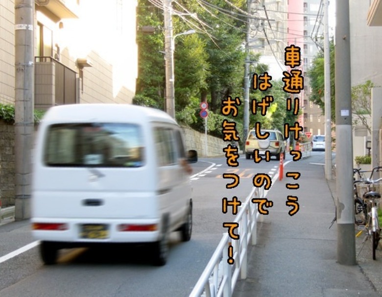 ↑細い一方通行の通りですが、交通量けっこうあります。
