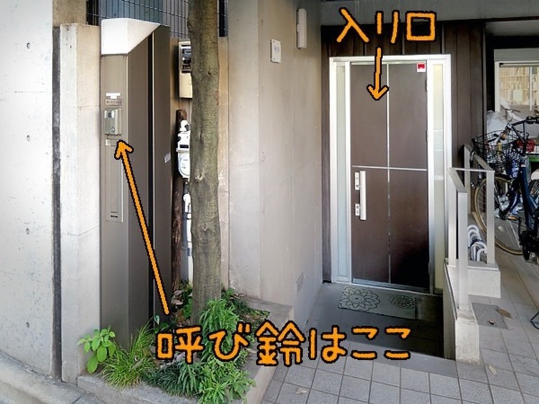 ↑チャイムはドアに降りていく階段の手前左にあります。