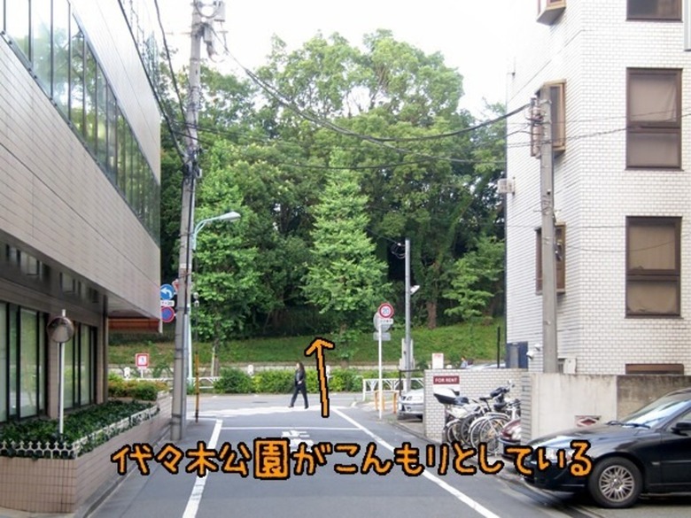 ↑途中、道路と交差するところで右を見ると、代々木公園が川の土手の上だということがよく分かる。