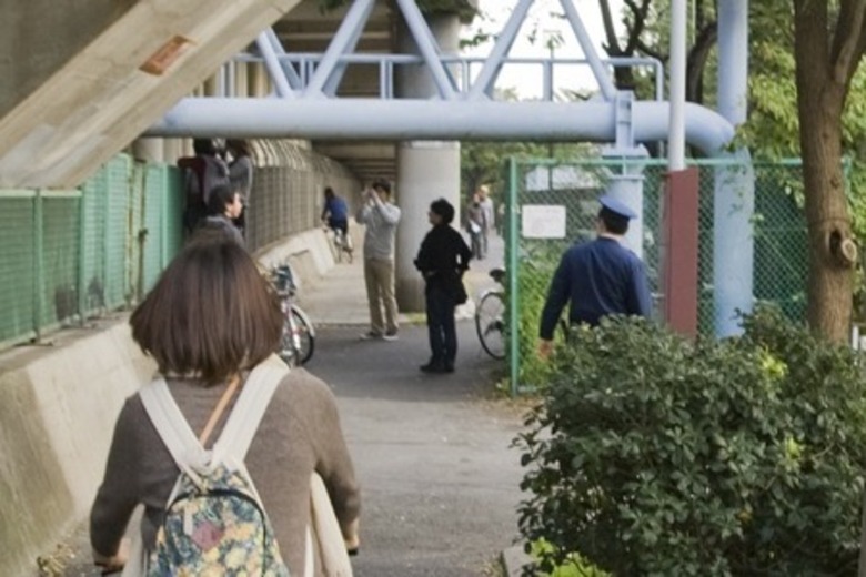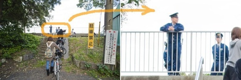【↑いたるところに警官の方々が。ごくろうさまです。その警官の方々がいぶかしがる中、わらわらと橋脚に群がる一行】