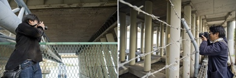 【↑厳重な警備の目前で橋脚にむちゅう!すみませんすみません。あやしいけど、あやしい者ではありません!ほんとうです!】